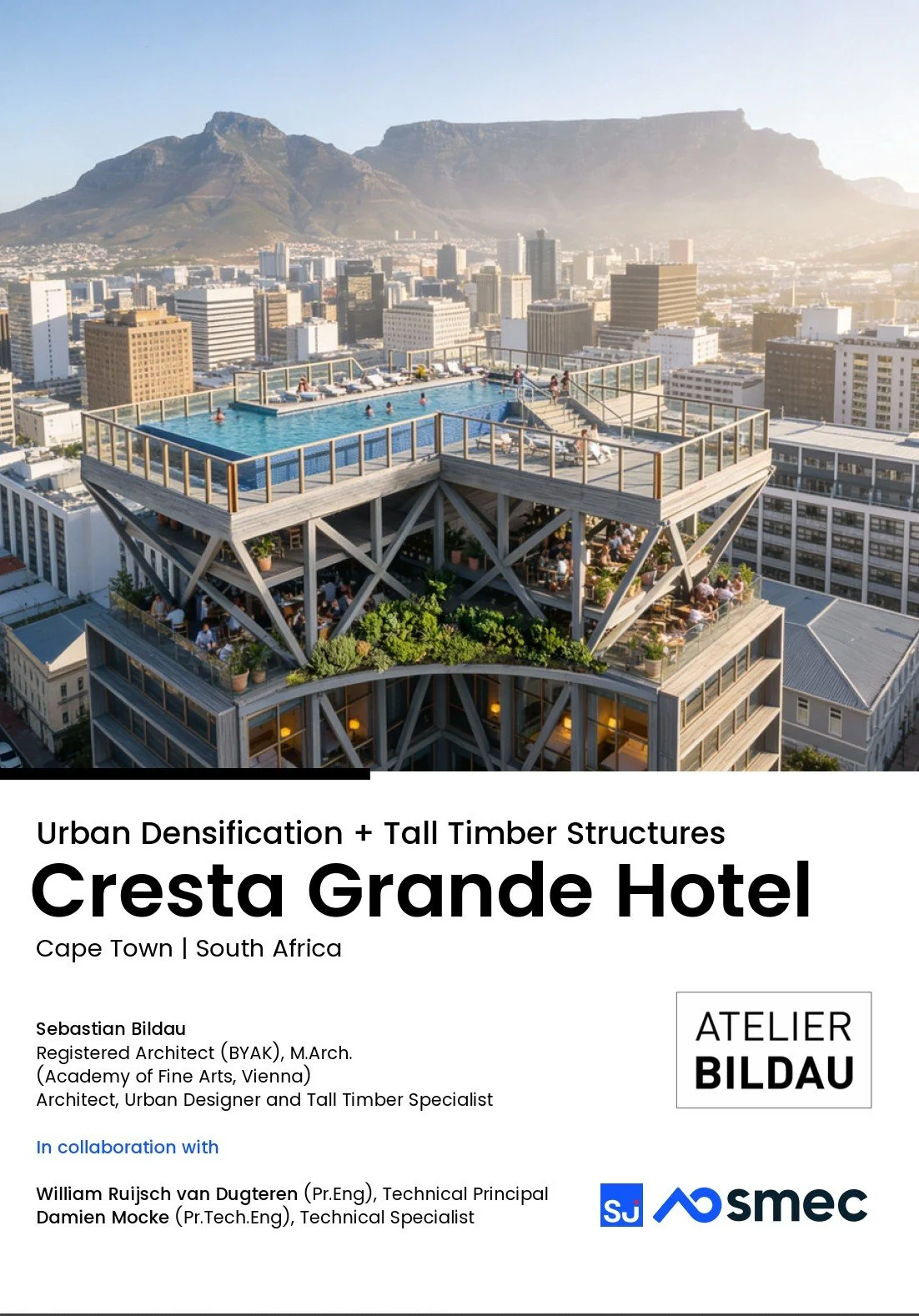The practical example of the Cresta Grande Hotel in Cape Town demonstrates how these concepts can be implemented: A joint research, design and feasibility project by Atelier Bildau and SMEC South Africa focuses on sustainable, large-scale timber construction and shows how existing buildings can be densified in a resource-efficient way.